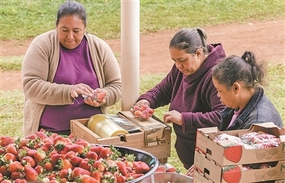中國(guó)三峽巴西公司在位于巴西南部格利保吉水電站周邊開(kāi)展創(chuàng)收創(chuàng)業(yè)試點(diǎn)項(xiàng)目。圖為當(dāng)?shù)剞r(nóng)戶正在分裝草莓。納塔利婭·弗洛爾攝