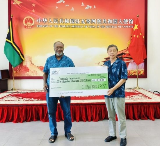 12月21日,中國駐瓦努阿圖大使李名剛(右)向瓦看守政府總理薩爾維轉(zhuǎn)交中國紅十字會向瓦提供的10萬美元緊急人道主義現(xiàn)匯援助。中國駐瓦努阿圖大使館供圖