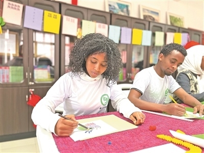 亞的斯亞貝巴大學孔子學院學生正在繪制富有中國元素的美術作品。