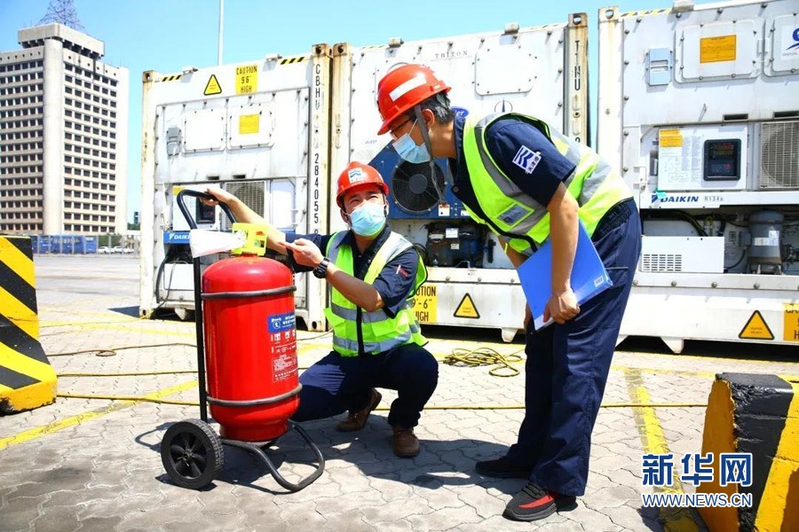 烈日當(dāng)空,天津港集裝箱碼頭公司安全員正在冷箱堆存場地檢查安全消防設(shè)施。新華網(wǎng)發(fā)
