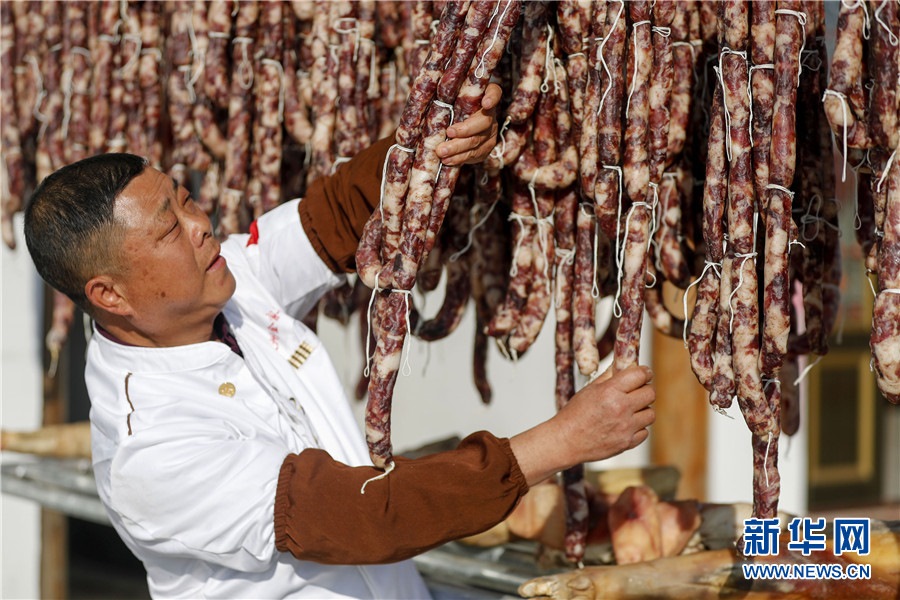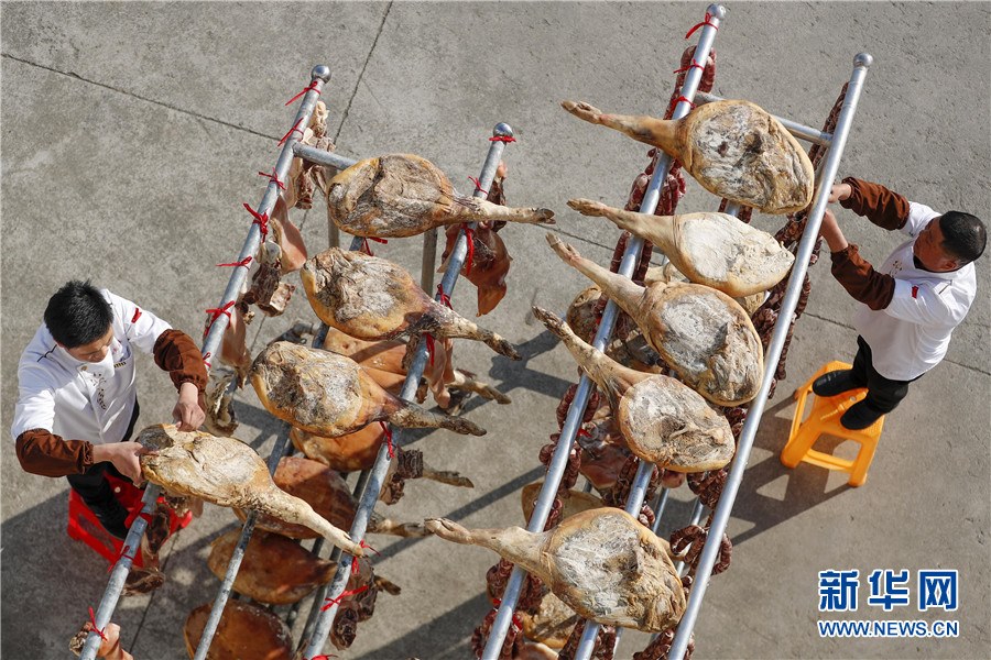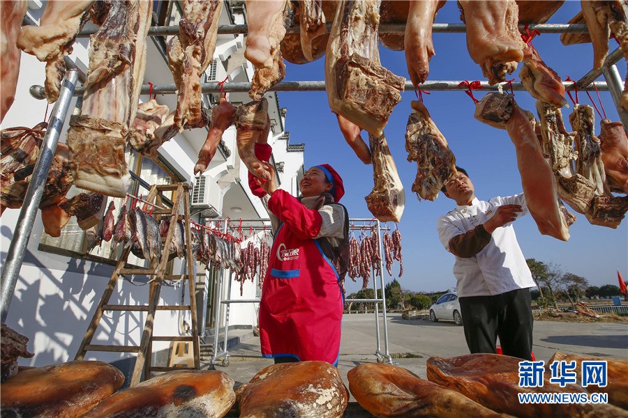 隨著春節(jié)臨近,安徽省黃山市徽州區(qū)西溪南鎮(zhèn)村民開(kāi)始制作徽州傳統(tǒng)臘味,腌制火腿、臘肉,灌制香腸,并進(jìn)行晾曬。臘味飄香,年味漸濃,制作、晾曬傳統(tǒng)臘味成為徽州一道獨(dú)特風(fēng)景。新華網(wǎng)發(fā)(施亞磊攝)