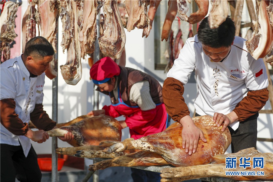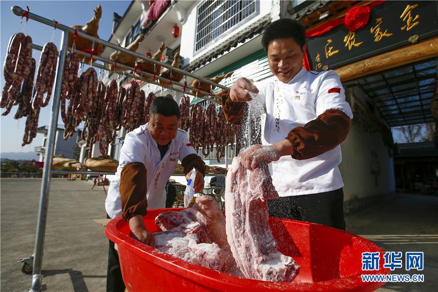 1月19日,在黃山市徽州區(qū)西溪南鎮(zhèn),村民正在腌制臘味。