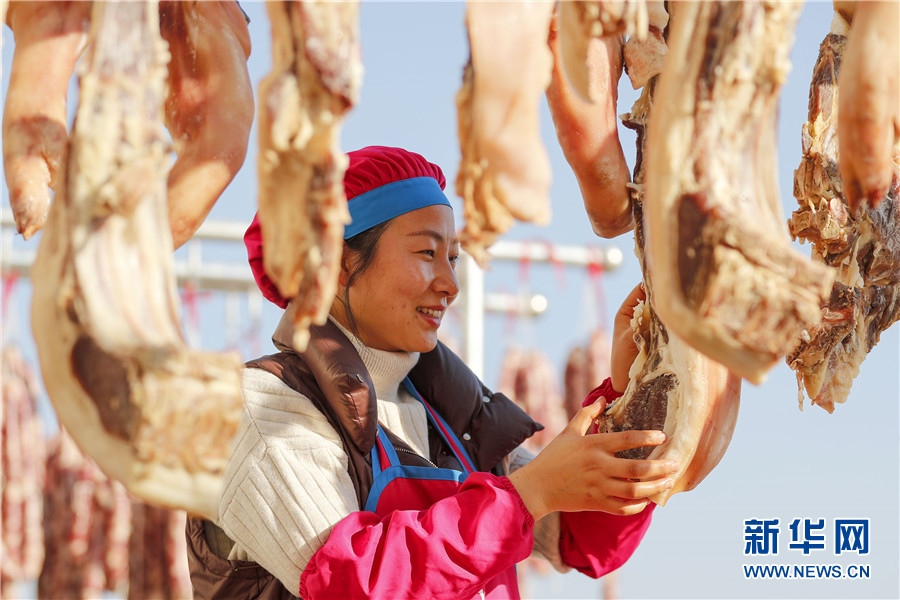 1月19日,在黃山市徽州區(qū)西溪南鎮(zhèn),村民在院子里晾曬的臘味。