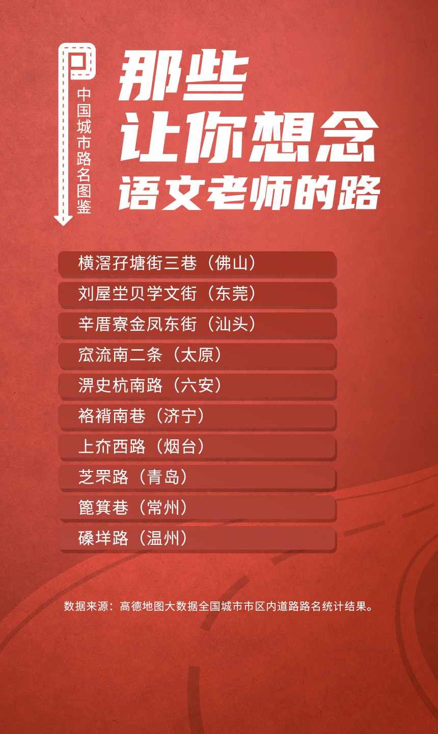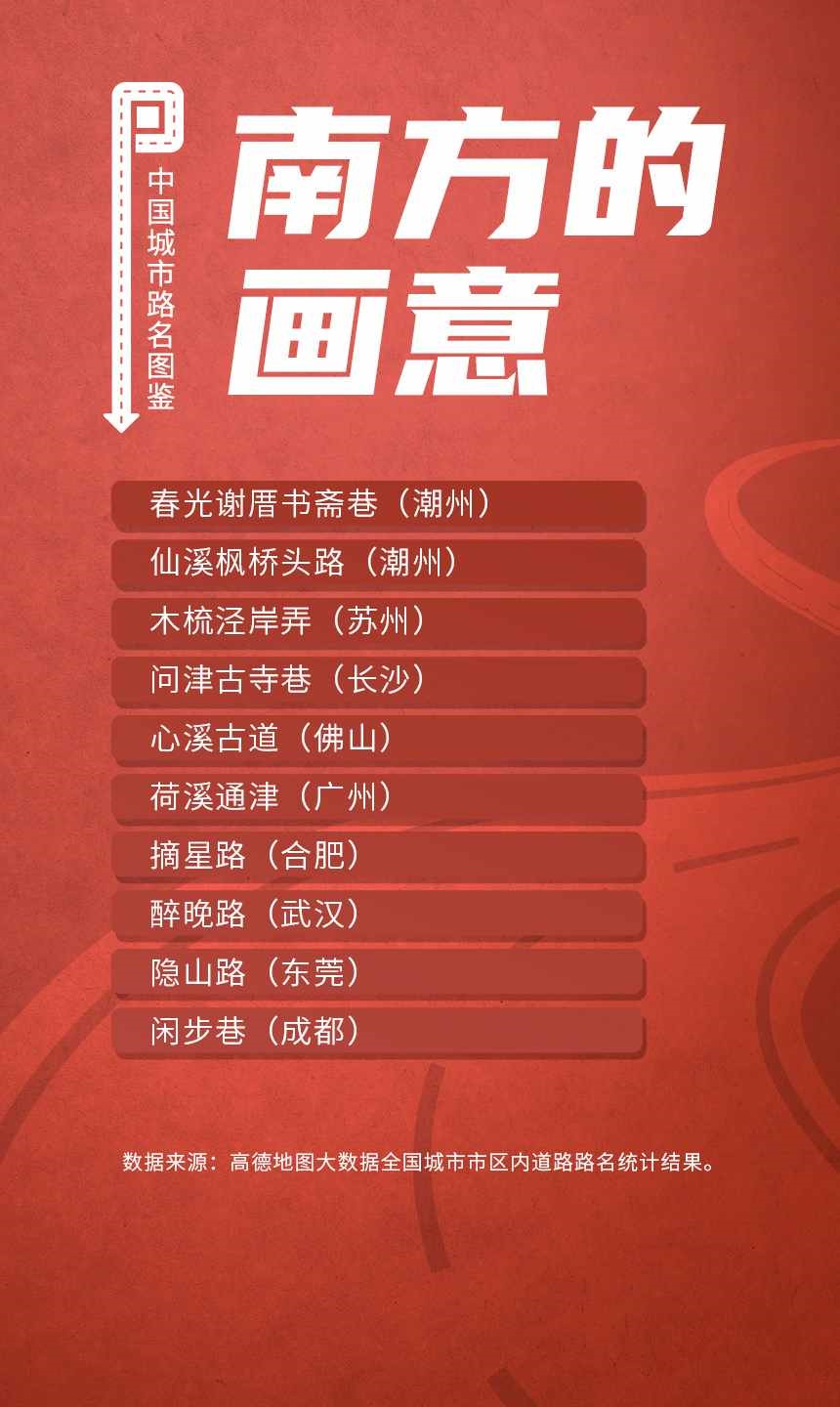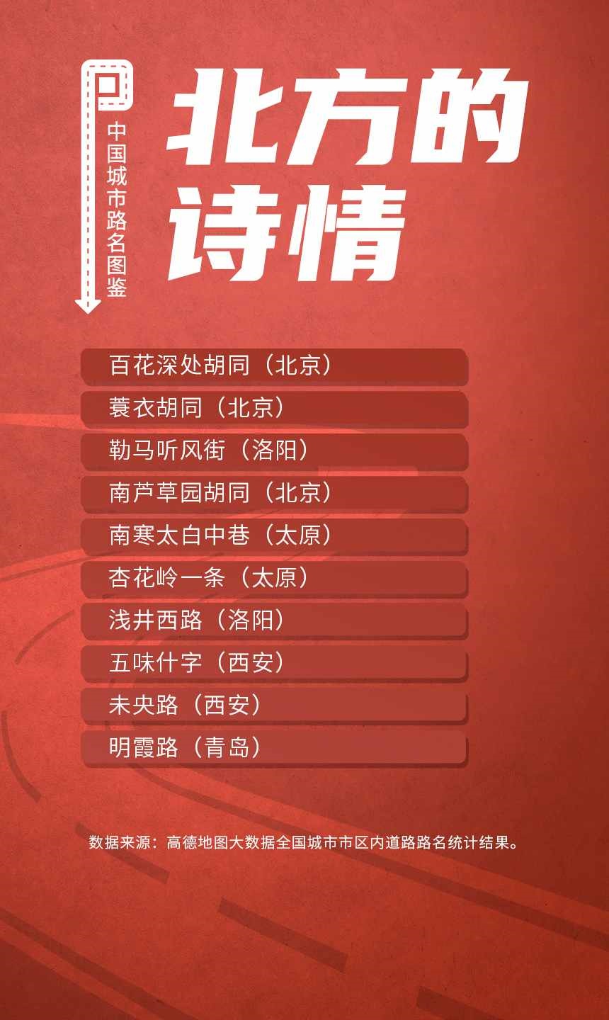 榜單顯示,人民路和建設(shè)路是全國重名率最高的道路,均有129個城市采用。此外,全國胡同最多的城市是北京;弄堂最多的城市是寧波;“小巷”最多的城市都在廣東省,深圳、東莞、中山、佛山和廣州包攬前五;“大道”最多的城市是佛山。
