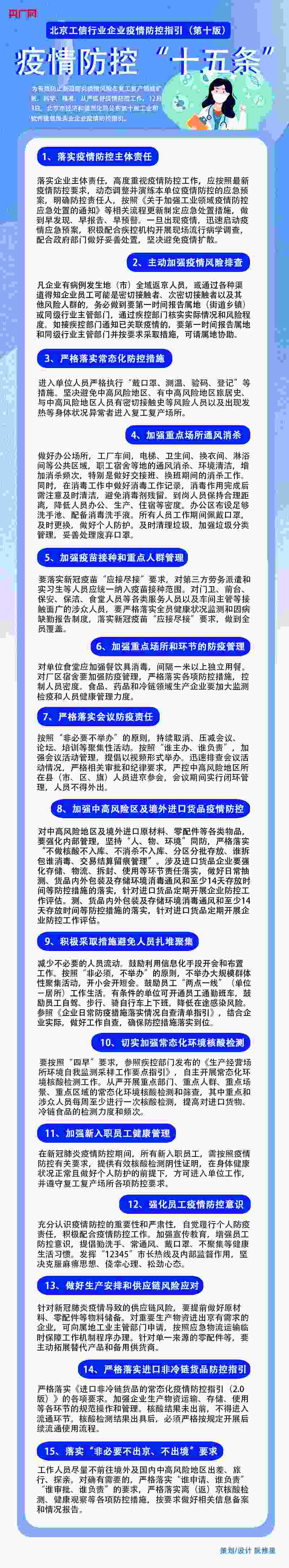央廣網(wǎng)北京12月5日消息 為有效防止新冠肺炎疫情風(fēng)險在復(fù)工復(fù)產(chǎn)領(lǐng)域擴散,科學(xué)、精準、從嚴抓好疫情防控工作,12月3日,北京市經(jīng)濟和信息化局公布第十版工業(yè)和軟件信息服務(wù)業(yè)企業(yè)疫情防控指引。