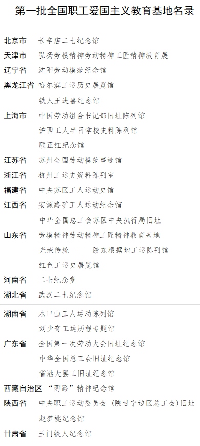 第一批全國(guó)職工愛(ài)國(guó)主義教育基地包括北京市長(zhǎng)辛店二七紀(jì)念館、黑龍江省鐵人王進(jìn)喜紀(jì)念館、上海市中國(guó)勞動(dòng)組合書記部舊址陳列館、廣東省全國(guó)第一次勞動(dòng)大會(huì)舊址紀(jì)念館、陜西省中央職工運(yùn)動(dòng)委員會(huì)(陜甘寧邊區(qū)總工會(huì))舊址等27家單位。旨在進(jìn)一步加強(qiáng)紅色工運(yùn)資源的保護(hù)挖掘和宣傳利用,引領(lǐng)各級(jí)工會(huì)努力把紅色工運(yùn)資源建設(shè)成為開(kāi)展黨史學(xué)習(xí)教育的重要陣地,打造成愛(ài)國(guó)主義教育、革命傳統(tǒng)教育、加強(qiáng)職工思想政治引領(lǐng)的生動(dòng)課堂,團(tuán)結(jié)引導(dǎo)廣大職工群眾更好傳承紅色基因、賡續(xù)紅色血脈、汲取奮進(jìn)力量。第一批全國(guó)職工愛(ài)國(guó)主義教育基地在中國(guó)工運(yùn)史上影響重大,代表性強(qiáng)、知名度高,現(xiàn)有的設(shè)施建設(shè)和保護(hù)利用較好,符合時(shí)代要求,具有較強(qiáng)的示范引領(lǐng)作用。
