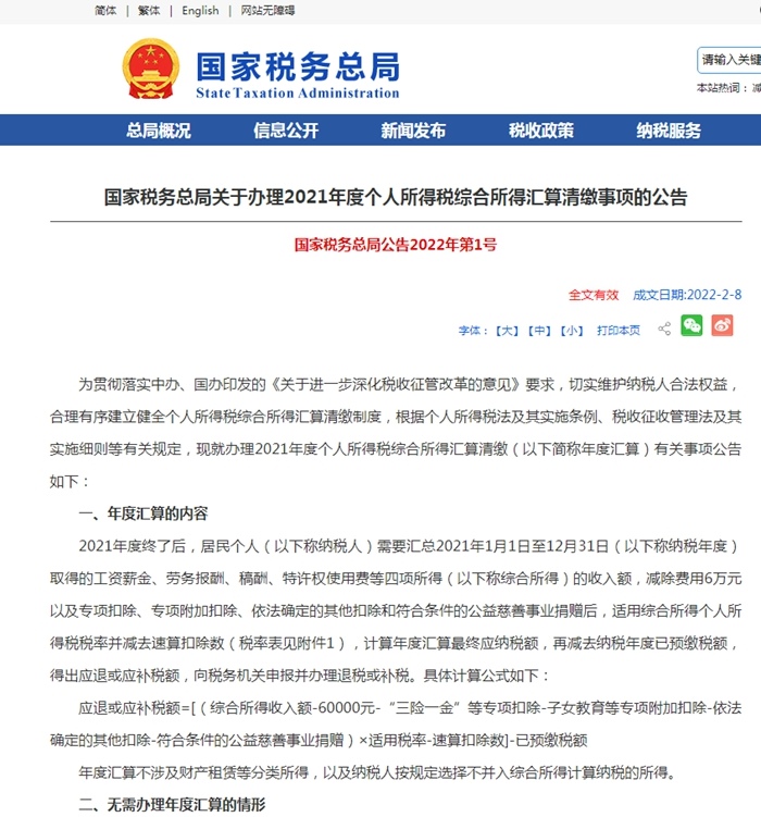 國(guó)家稅務(wù)總局關(guān)于辦理2021年度個(gè)人所得稅