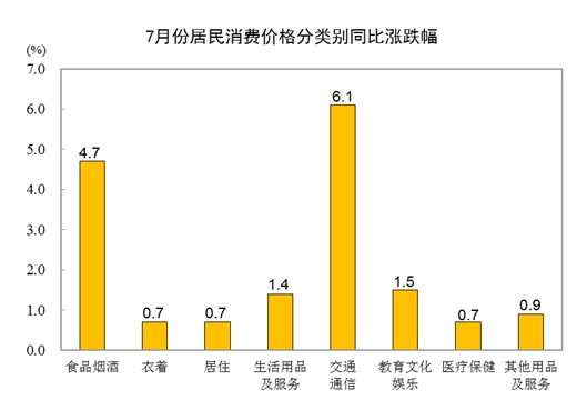 其他七大類價格同比均上漲。其中,交通通信、教育文化娛樂價格分別上漲6.1%和1.5%,生活用品及服務(wù)、其他用品及服務(wù)價格分別上漲1.4%和0.9%,衣著、居住、醫(yī)療保健價格均上漲0.7%。