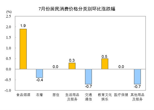7月份,全國居民消費價格環(huán)比上漲0.5%。其中,城市上漲0.4%,農(nóng)村上漲0.5%;食品價格上漲3.0%,非食品價格下降0.1%;消費品價格上漲0.6%,服務(wù)價格上漲0.3%。