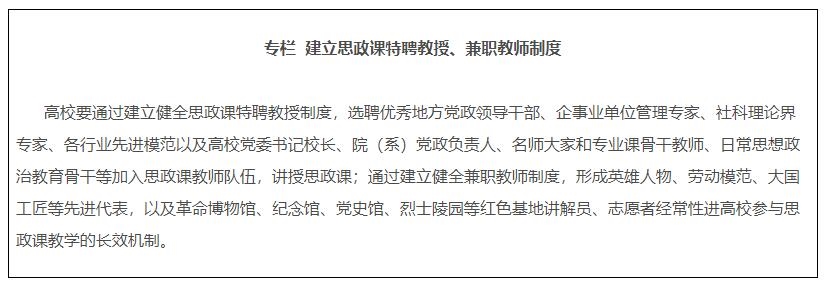 14.建設(shè)專兼結(jié)合的師資隊伍。各地各校嚴格按照要求配備建強高校專職思政課教師、輔導(dǎo)員隊伍,提高中小學(xué)專職思政課教師比例,實行思政課特聘教授、兼職教師制度,積極聘請黨政領(lǐng)導(dǎo)、科學(xué)家、老同志、先進模范等擔任思政課兼職教師。深入實施馬克思主義學(xué)院院長(書記)培養(yǎng)工程,通過集中培養(yǎng)培訓(xùn)、委托重大項目、加強實踐鍛煉、開展國際國內(nèi)訪學(xué)等方式,培養(yǎng)一批青年馬克思主義理論家。