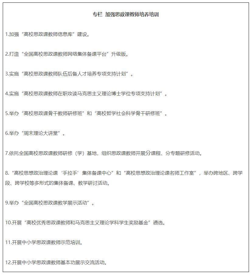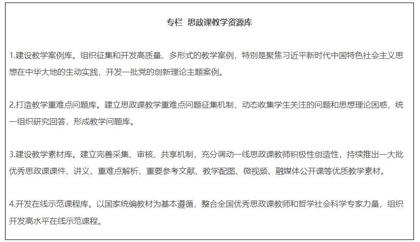 19.全面推進課程思政高質(zhì)量建設(shè)。教育部組建高等學(xué)校課程思政教學(xué)指導(dǎo)委員會,研制普通本科專業(yè)類課程思政教學(xué)指南,組織開展高校教師課程思政教學(xué)能力培訓(xùn),建設(shè)一批課程思政系列共享資源庫。建成一批課程思政示范高校,推出一批課程思政示范課程,選樹一批課程思政教學(xué)名師和團隊,建設(shè)一批高校課程思政教學(xué)研究示范中心。加強中小學(xué)學(xué)科德育建設(shè)。