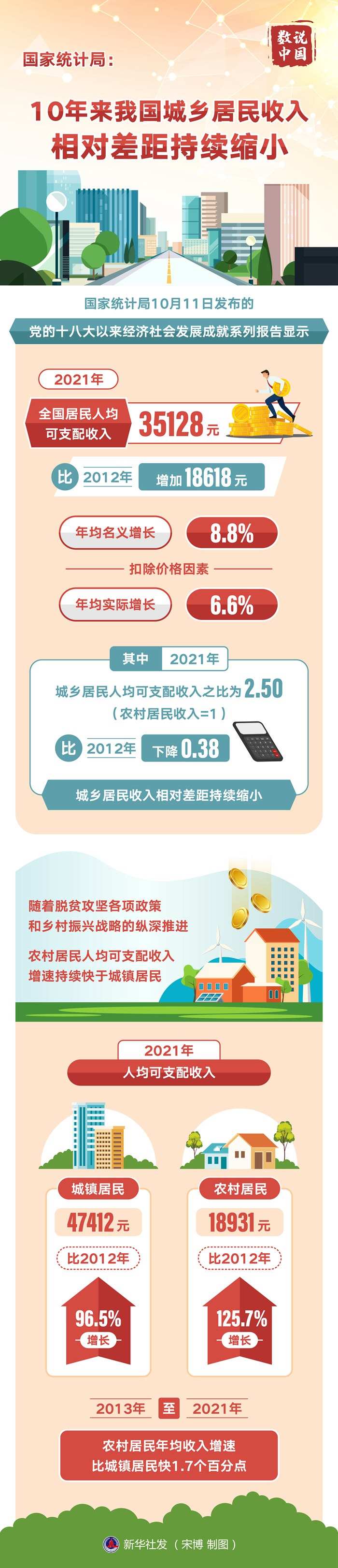 新華社北京10月11日電(記者魏玉坤、嚴賦憬)國家統(tǒng)計局11日發(fā)布的黨的十八大以來經(jīng)濟社會發(fā)展成就系列報告顯示,2021年全國居民人均可支配收入35128元,比2012年增加18618元,年均名義增長8.8%,扣除價格因素,年均實際增長6.6%。其中,2021年城鄉(xiāng)居民人均可支配收入之比為2.50(農(nóng)村居民收入=1),比2012年下降0.38,城鄉(xiāng)居民收入相對差距持續(xù)縮小。