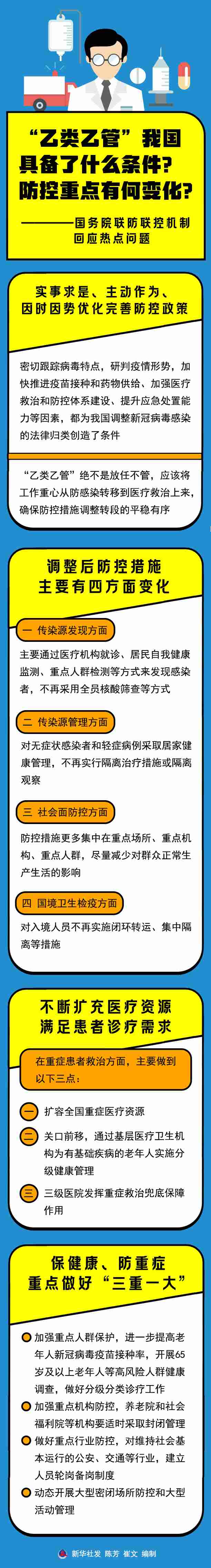 國(guó)家衛(wèi)生健康委疫情應(yīng)對(duì)處置工作領(lǐng)導(dǎo)小組專家組組長(zhǎng)梁萬(wàn)年說(shuō),“乙類乙管”絕不是放任不管,應(yīng)該將工作重心從防感染轉(zhuǎn)移到醫(yī)療救治上來(lái),確保防控措施調(diào)整轉(zhuǎn)段的平穩(wěn)有序。