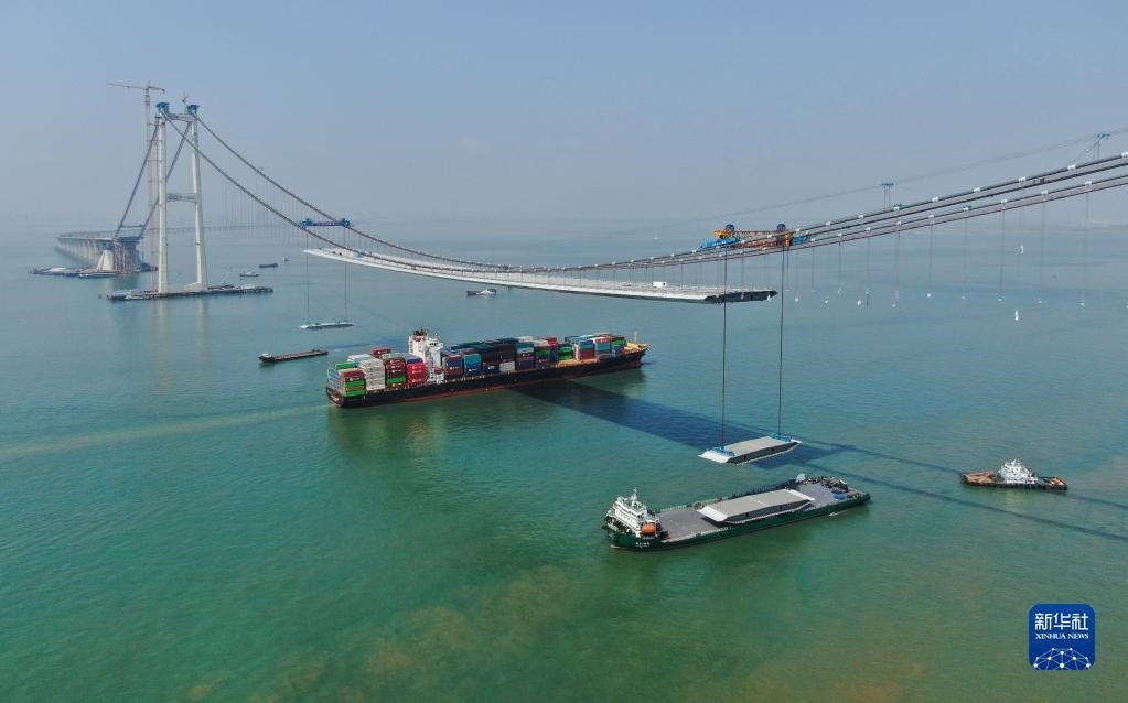 集裝箱貨輪通過正在吊裝鋼箱梁的深中通道伶仃洋大橋(2023年2月22日攝,無人機(jī)照片)。新華社記者 鄧華 攝