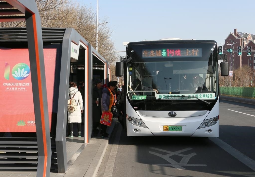 乘客在中新天津生態(tài)城的一座智慧公交站乘坐免費的純電動公交車。