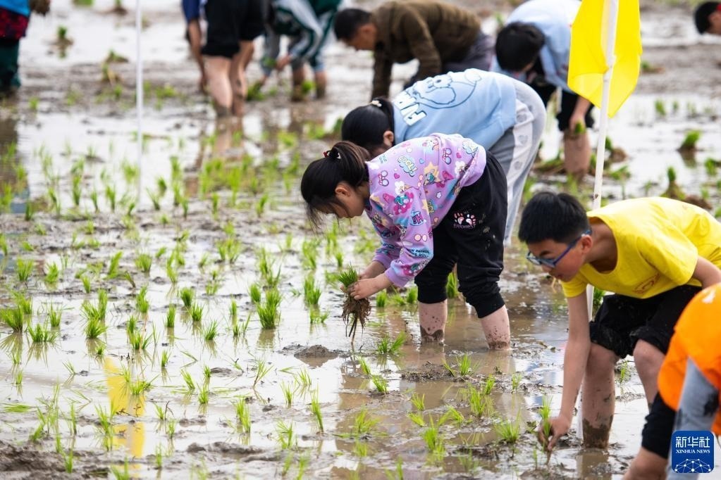 當(dāng)日,在湖南省長沙市寧鄉(xiāng)市灰湯鎮(zhèn)花果山村舉行的農(nóng)耕民俗文化節(jié)學(xué)生研學(xué)活動中,孩子們通過開展稻田插秧、捉泥鰍等“農(nóng)趣” 比賽,走進田間地頭,感受勞動帶來的艱辛與快樂。新華社記者 陳思汗 攝