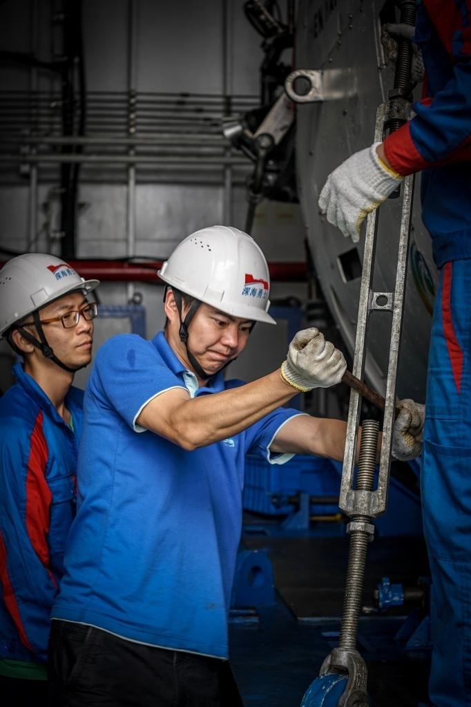 圖為楊申申(中)在海上試驗(yàn)現(xiàn)場忙碌工作。