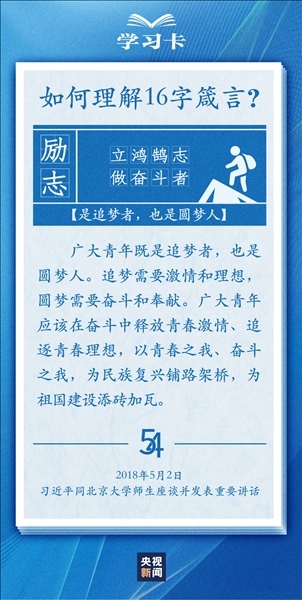 青春,是人生最美的時光。青年,是國家的未來和民族的希望。每每與青年對話,習近平總書記無不囑托青年“立大志”“堅定理想信念”“擔當復興大任”,言之諄諄,意之殷殷。對于新時代青年如何走好人生路,習近平總書記2018年提出十六字箴言,字短意長。今天,一起學習↓