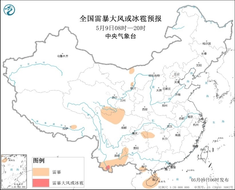 預(yù)計5月9日08時至10日08時,云南西南部、海南島東北部和西南部等地的部分地區(qū)將有短時強降水天氣,小時雨量20-30毫米,局地可達50毫米以上;另外,云南西南部局地將有雷暴大風(fēng)或冰雹天氣。