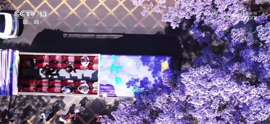 總臺(tái)記者 郭琳潔:我現(xiàn)在是在昆明的教場(chǎng)中路,5月上旬,道路兩側(cè)的藍(lán)花楹競(jìng)相綻放,將這條1.4公里長(zhǎng)的道路裝扮成一條紫色長(zhǎng)廊。