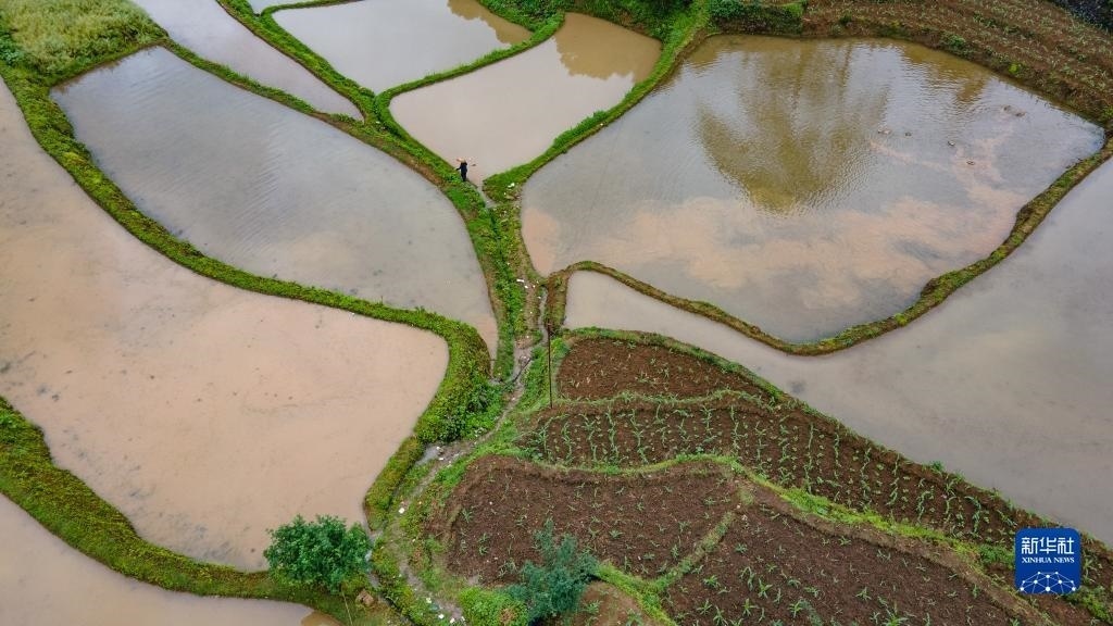 5月6日,在重慶市秀山土家族苗族自治縣洪安鎮(zhèn)美其村,村民在田間行走(無(wú)人機(jī)照片)。