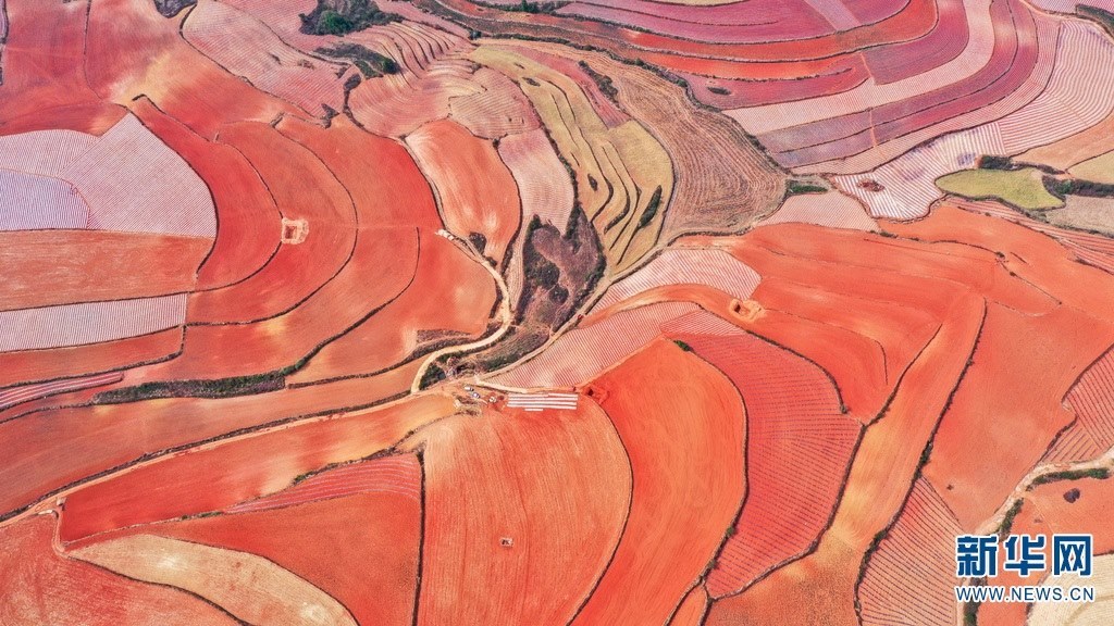 云南省尋甸回族彝族自治縣,連綿不斷的旱梯田遍布山間,遠(yuǎn)接天邊,每年4-5月,經(jīng)過村民翻新、平整后的紅褐色土地,從空中俯瞰五彩斑斕、蔚為壯觀。當(dāng)?shù)卮迕裥燎诟旁诜饰值募t土地上,用勤勞的雙手,繪就一幅幅勞動藝術(shù)畫作。新華網(wǎng)發(fā)(孫文來 攝影報道)