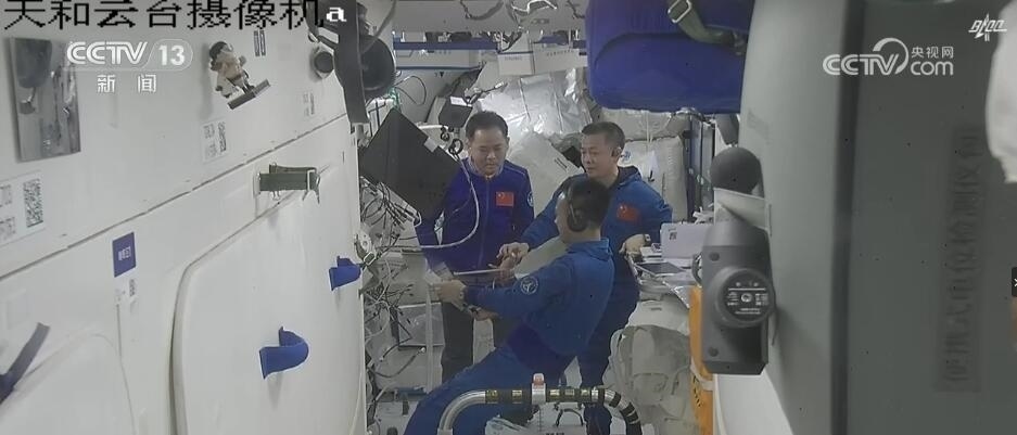 航天科技集團(tuán)五院載人飛船系統(tǒng)項目技術(shù)副經(jīng)理 邵立民:他倆(兩個乘組)之間就可以在對接通道之間相互見到,也可以握手,搞個簡短的歡迎儀式,然后,神十六乘組三個(航天員)就依次能夠進(jìn)入到天和核心艙里面去。如果要真正進(jìn)到核心艙的工作區(qū)里邊,還有一個雙向承壓艙門,也就是在節(jié)點艙和空間站的生活艙之間還有一道艙門。