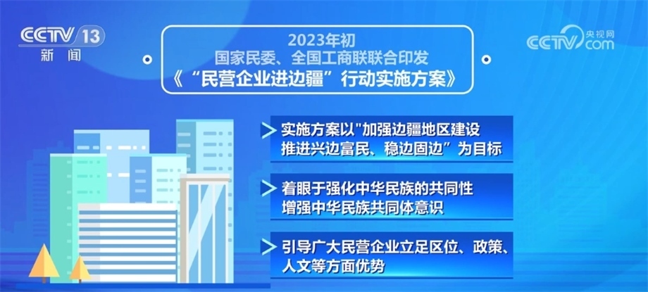 2023年初,國家民委、全國工商聯(lián)聯(lián)合印發(fā)了《“民營企業(yè)進(jìn)邊疆”行動(dòng)實(shí)施方案》,實(shí)施方案以“加強(qiáng)邊疆地區(qū)建設(shè),推進(jìn)興邊富民、穩(wěn)邊固邊”為目標(biāo),著眼于強(qiáng)化中華民族的共同性、增強(qiáng)中華民族共同體意識(shí),引導(dǎo)廣大民營企業(yè)立足區(qū)位、政策、人文等方面優(yōu)勢,積極參與邊疆地區(qū)基礎(chǔ)設(shè)施建設(shè),助力邊疆地區(qū)提升資源轉(zhuǎn)化能力,推動(dòng)邊疆地區(qū)融入全國統(tǒng)一大市場,促進(jìn)邊疆各民族交往交流交融,共同走向社會(huì)主義現(xiàn)代化,實(shí)現(xiàn)共同富裕。