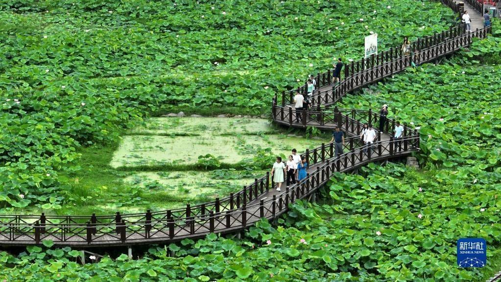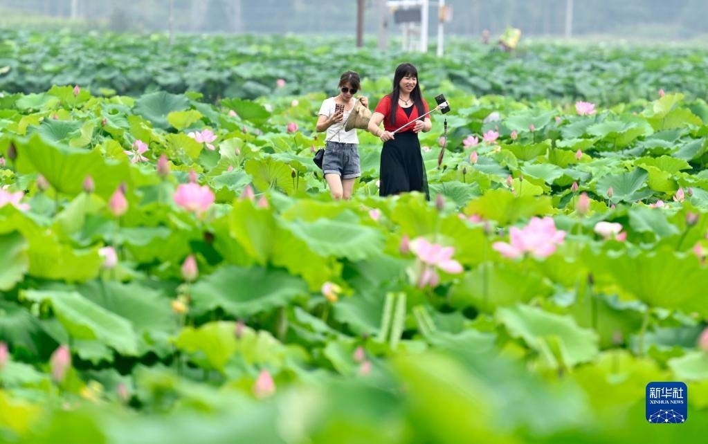 6月13日,游客在柳州市柳江區(qū)百朋鎮(zhèn)萬畝荷塘里游玩。