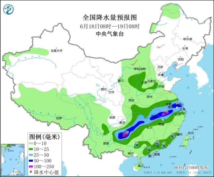 17日至19日,西南地區(qū)東部、江漢、江淮、江南、華南等地有大范圍較強降雨過程,部分地區(qū)有大到暴雨,局地大暴雨,并伴有短時強降水、雷暴大風等強對流天氣。其中,6月17日08時至18日08時,江淮大部、江漢大部、湖南北部、重慶中東部、貴州北部、廣西北部和南部沿海、廣東中南部、福建南部以及西藏東南部、云南西北部等地部分地區(qū)有大到暴雨,其中,湖北東部、重慶東南部、貴州東北部、廣東中南部等地部分地區(qū)有大暴雨(100~150毫米)。上述部分地區(qū)伴有短時強降水(最大小時降雨量20~60毫米,局地可超過70毫米),局地有雷暴大風等強對流天氣。中央氣象臺6月17日06時繼續(xù)發(fā)布暴雨藍色預警。