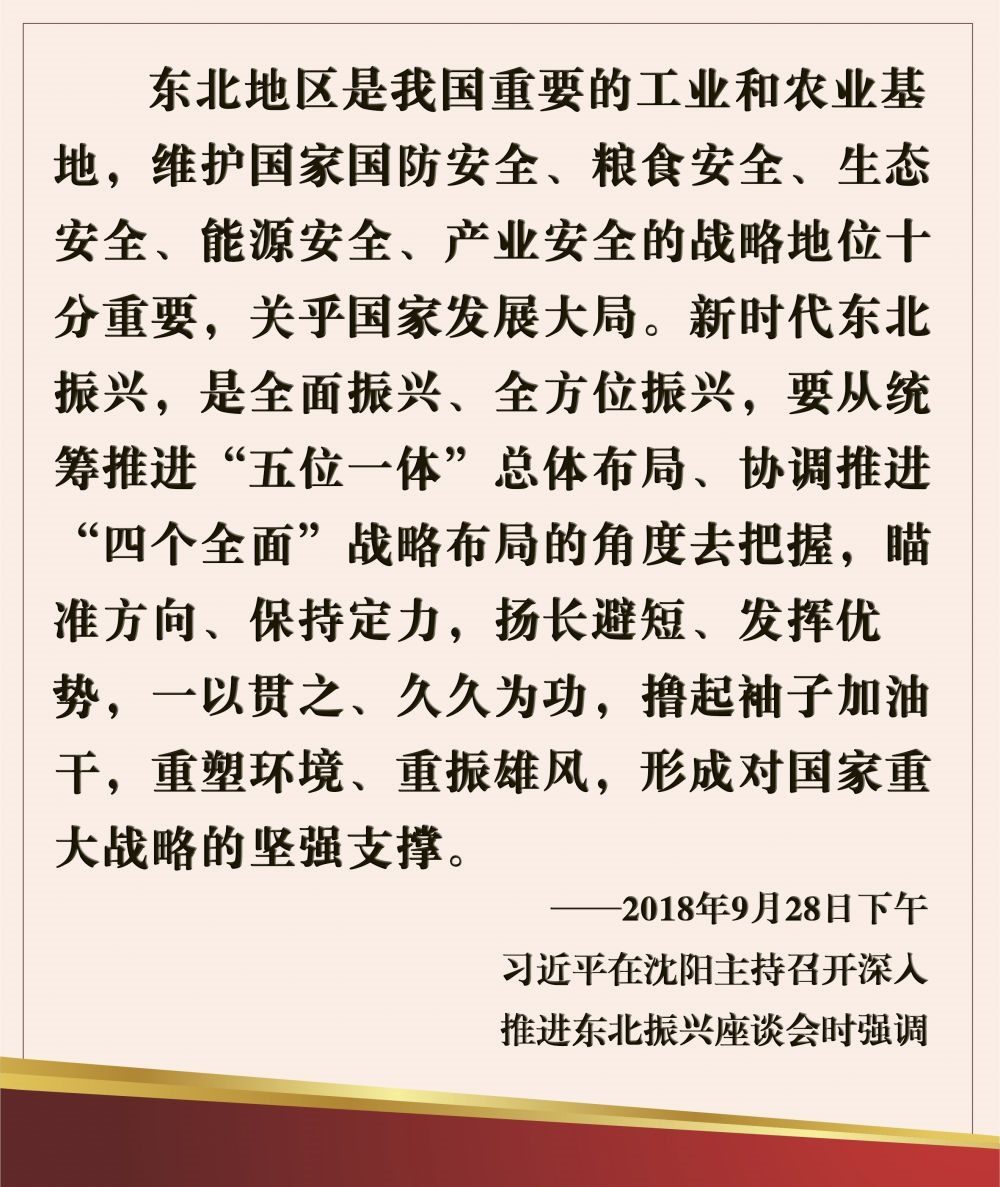 他強調(diào),新時代新征程推動東北全面振興,要貫徹落實黨的二十大關于推動東北全面振興實現(xiàn)新突破的部署,完整準確全面貫徹新發(fā)展理念,牢牢把握東北在維護國家“五大安全”中的重要使命,牢牢把握高質(zhì)量發(fā)展這個首要任務和構建新發(fā)展格局這個戰(zhàn)略任務,統(tǒng)籌發(fā)展和安全,堅持目標導向和問題導向相結(jié)合,堅持鍛長板、補短板相結(jié)合,堅持加大支持力度和激發(fā)內(nèi)生動力相結(jié)合,咬定目標不放松,敢闖敢干加實干,努力走出一條高質(zhì)量發(fā)展、可持續(xù)振興的新路子,奮力譜寫東北全面振興新篇章。
