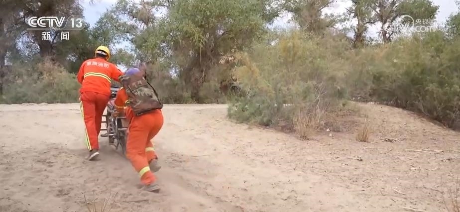 因?yàn)楣茏o(hù)面積大,中午護(hù)林員只能用攜帶的干糧充饑。為了近距離查看胡楊樹的情況,他們大多數(shù)時候要在林中小路里穿梭。有的地方路況不好,就需要推著摩托車行走,難免遇到連人帶車陷進(jìn)沙地里的情況,要格外小心。