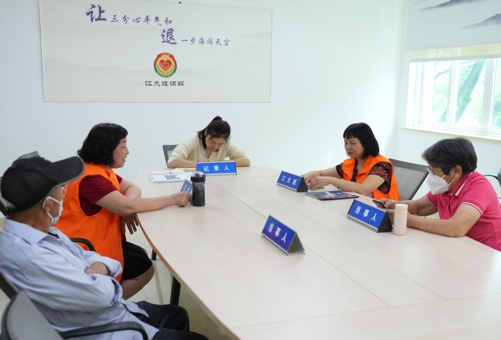 在浙江紹興諸暨市暨陽(yáng)街道江新社區(qū)“江大姐”調(diào)解室,兩名調(diào)解員在為群眾進(jìn)行調(diào)解。這個(gè)調(diào)解工作室成員主要由女性組成,為周邊居民調(diào)解鄰里、家庭矛盾(2023年5月26日攝)。