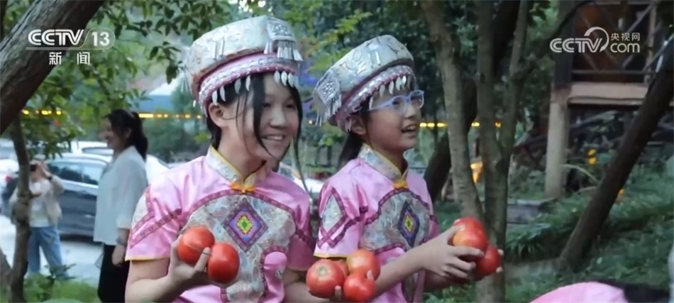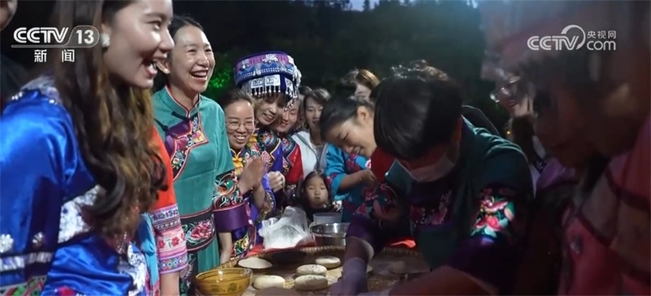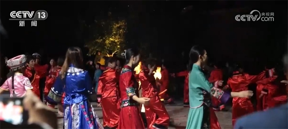 隨著歡快的音樂響起,當(dāng)?shù)卮迕翊┥仙术r艷的節(jié)日盛裝,踏著鼓點(diǎn),圍著篝火跳起土家擺手舞,豐收的喜悅洋溢在村民們的臉上,游客們加入其中,大家手牽著手,共同舞出金秋和美鄉(xiāng)村新畫卷。