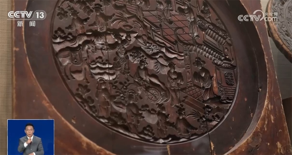總臺(tái)記者 羅子瑛:瞧,我發(fā)現(xiàn)的這塊月餅?zāi)>咦龀鰜淼脑嘛炛睆侥軌蜻_(dá)到五六十公分,上面雕刻的花紋記錄了一位新科狀元回家為母親祝壽的場景??梢哉f月餅這樣一種食物,是用最樸素的方式記錄了人們的美好生活。