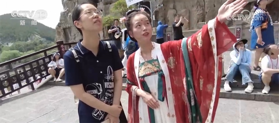 ?????? 記者 徐倩:在龍門石窟,我發(fā)現(xiàn)一個很特別的點,往年來這里,都是導(dǎo)游來陪大家一起逛龍門石窟、來講解。今年的導(dǎo)游做了一個服務(wù)升級,會穿著這種比較有特色的唐裝。