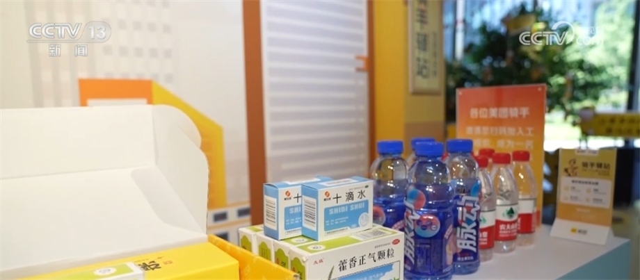 記者在北京市某防暑驛站看到,中午十二點(diǎn),外賣騎手正在送單的空閑間隙里休息。這里不僅備有解熱鎮(zhèn)痛類、止瀉類、防暑類功能藥品,還有冷飲、西瓜等消暑餐食,像這樣的防暑驛站在全國(guó)有7000多個(gè)。