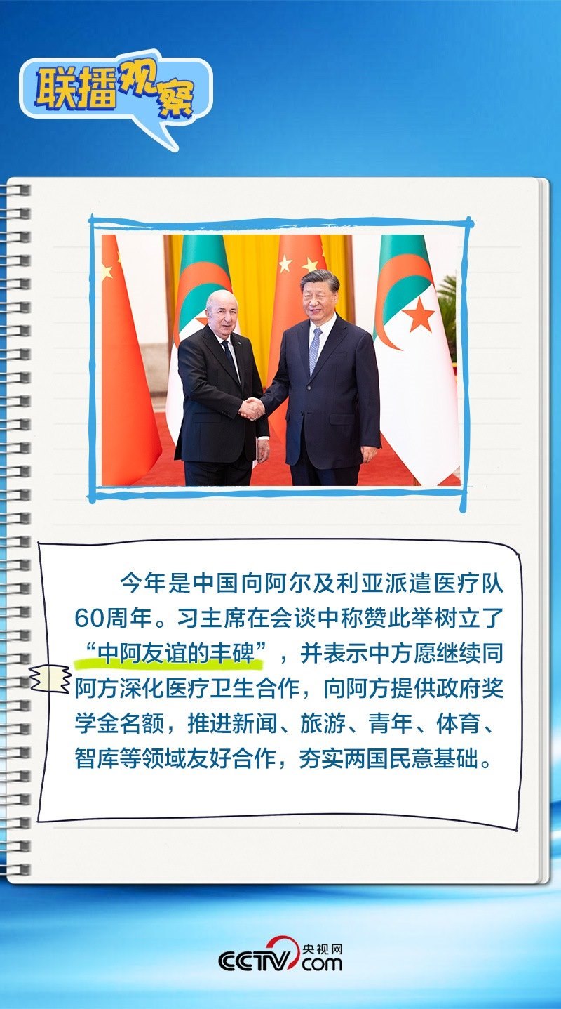 會(huì)談中,習(xí)主席特別提到,今年是中國(guó)向阿爾及利亞派遣醫(yī)療隊(duì)60周年,并稱贊此舉樹立了“中阿友誼的豐碑”。中阿傳統(tǒng)友誼深厚,兩國(guó)始終相互尊重、平等相待、彼此支持,締造了一段段友好交往的佳話。