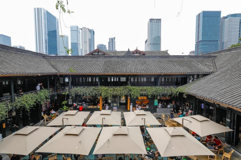 人們在成都太古里大慈寺內(nèi)的茶社喝茶、休閑,不遠(yuǎn)處高樓林立