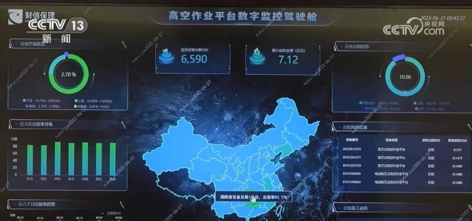 在湖南這家金融機構的大屏幕上,一個個小點組成了全國6500多臺高空作業(yè)設備的實時運行數(shù)據(jù)圖。動動手指,生產的每臺設備的地理位置、開機狀態(tài)和運行情況等數(shù)據(jù)都清晰可見。