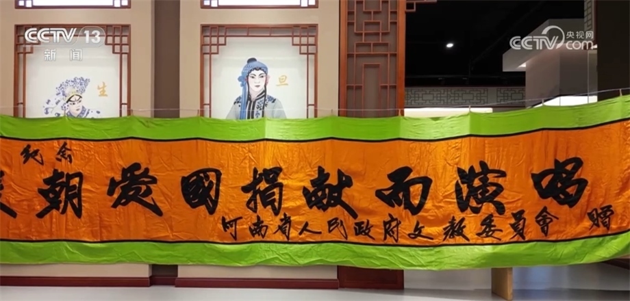 總臺記者 李恩浩:在河南省戲曲聲音博物館,有這樣一個十多米的條幅,上面寫著“為抗美援朝愛國捐獻而演唱”,這是香玉劇社義演的第一場,河南省人民政府特意為了支持他們的愛國行動贈送的,當(dāng)時香玉劇社在全國義演時它就掛在舞臺上方。