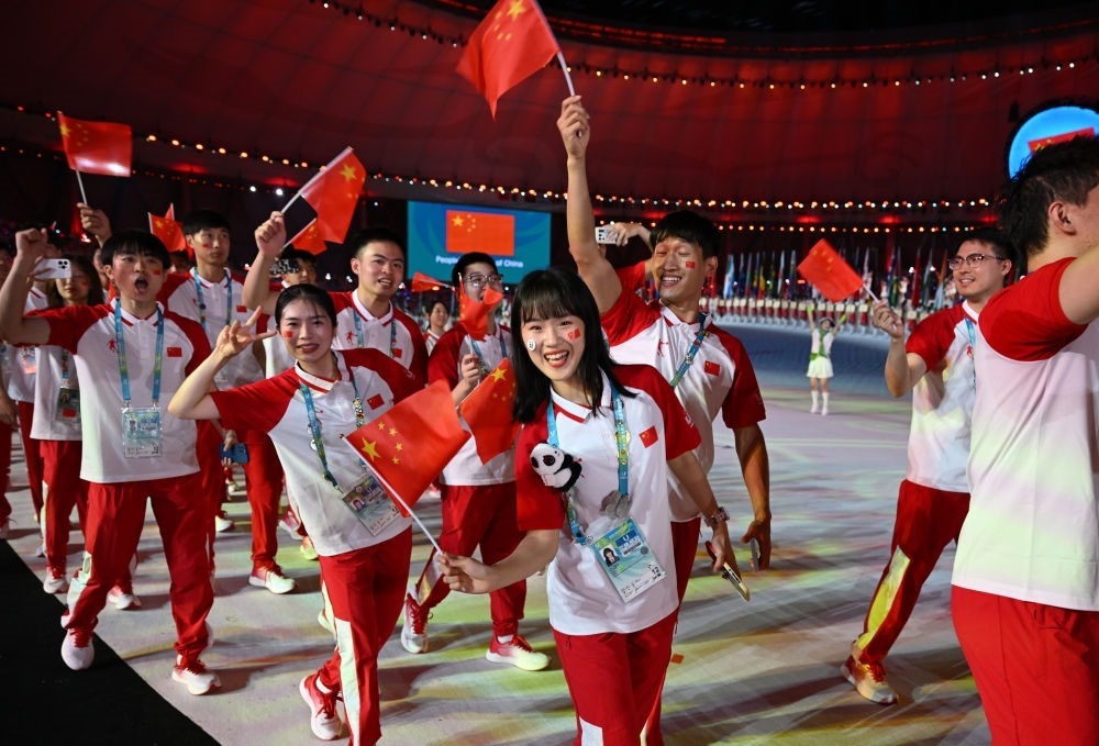 中國(guó)大學(xué)生體育代表團(tuán)在開幕式上入場(chǎng)。