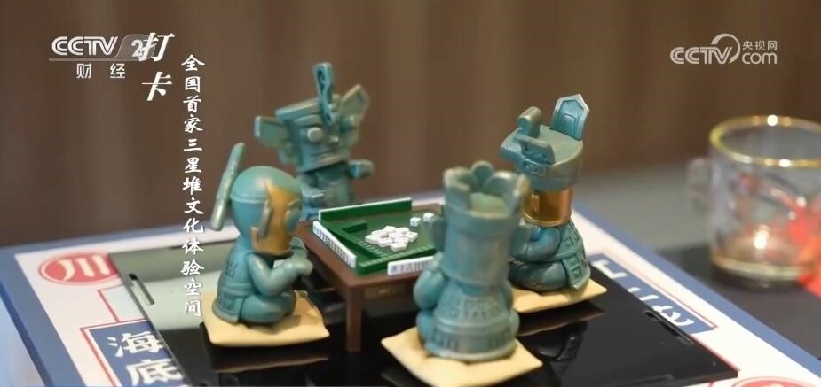 成都臺記者 劉然然:大家看我手中拿著的銅人,是按照三星堆博物館中的青銅人首鳥身像藏品復(fù)刻的。無論是造型還是材質(zhì),都盡量做到和館藏一致。這里是三星堆博物館官方授權(quán)的全國首家體驗(yàn)空間。