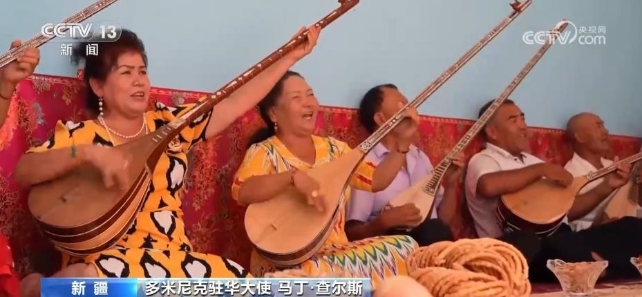 駐華使節(jié)們走進喀什古城的街市巷陌,感受當?shù)鬲毺氐拿褡逦幕?;在克孜爾千佛洞,領略跨越千年的石窟藝術;來到新疆民間手工樂器制作第一村庫車市新和縣加依村,同當?shù)匕傩找黄疠d歌載舞;觀看非遺項目十二木卡姆等一系列活動,讓使節(jié)們感嘆,新疆少數(shù)民族傳統(tǒng)文化和生活習俗得到了充分保護。