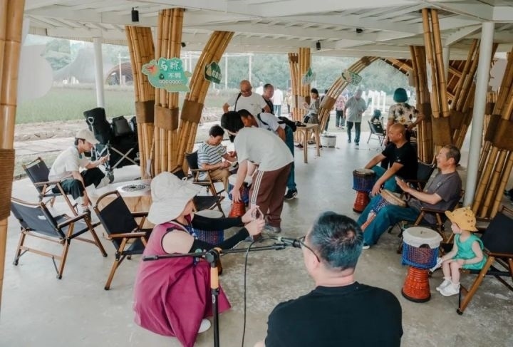 余村游客在竹建筑下體驗(yàn)非洲鼓