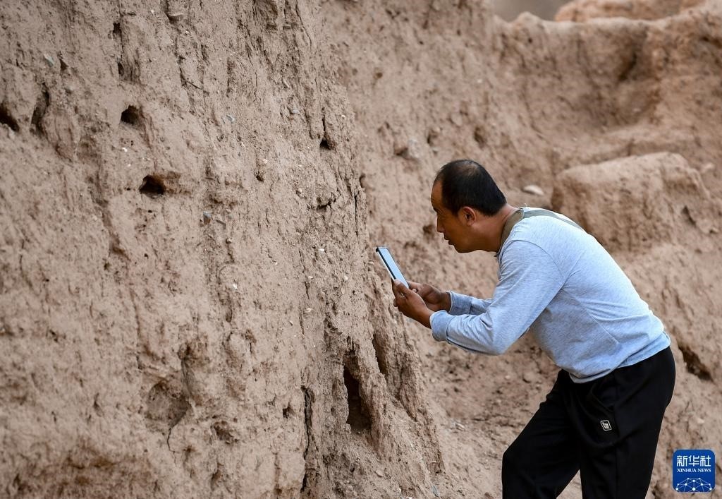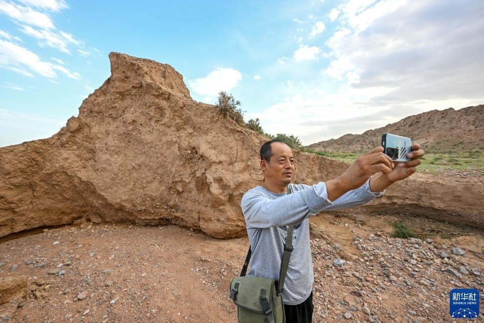 8月20日,董海寧巡查賀蘭山沿線的明長城永寧段時用手機(jī)拍照記錄。新華社記者 連振 攝