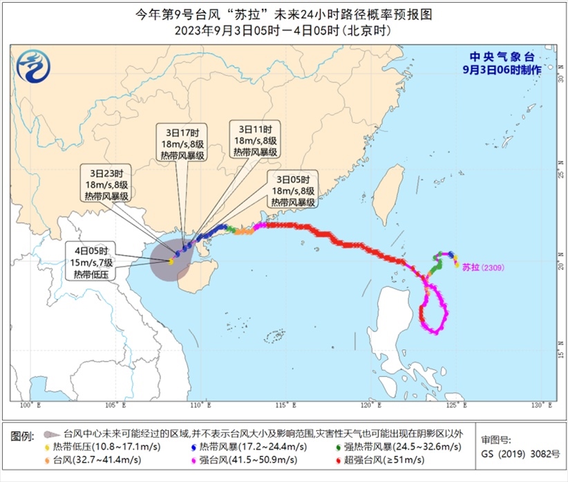 大風預報:9月3日08時至4日08時,受“蘇拉”影響,北部灣、瓊州海峽以及廣西南部沿海、海南島北部沿海等地將有6-7級大風,其中北部灣部分海域?qū)⒂?級、陣風9-10級的大風;受“海葵”影響,巴士海峽、臺灣海峽、臺灣以東洋面、東海南部及釣魚島附近海域以及浙江南部沿海、福建沿海、臺灣島沿海將有6-8級、陣風9-10級大風,部分海域或地區(qū)的風力有9-12級,陣風13-14級,“??敝行慕?jīng)過的附近海面或地區(qū)的風力有13-16級,陣風17級。