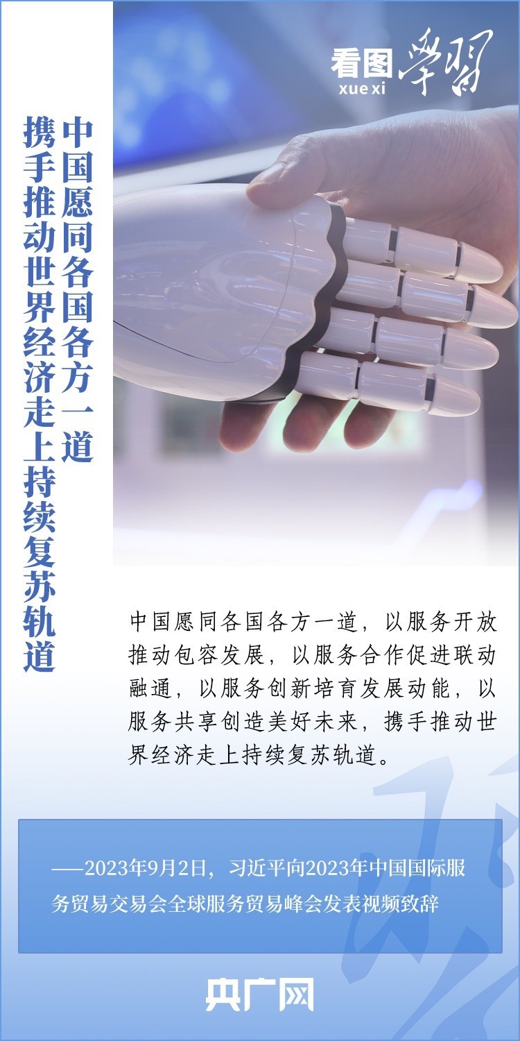 9月2日上午,以“開(kāi)放引領(lǐng)發(fā)展 合作共贏未來(lái)”為主題的2023年中國(guó)國(guó)際服務(wù)貿(mào)易交易會(huì)在北京舉行。國(guó)家主席習(xí)近平向2023年中國(guó)國(guó)際服務(wù)貿(mào)易交易會(huì)全球服務(wù)貿(mào)易峰會(huì)發(fā)表視頻致辭表示,中國(guó)愿同各國(guó)各方一道,攜手推動(dòng)世界經(jīng)濟(jì)走上持續(xù)復(fù)蘇軌道。一起來(lái)學(xué)習(xí)!