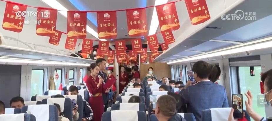 車廂內(nèi)掛滿了國(guó)慶主題的旗幟、窗花,“天路格?;ā蔽乃囆》株?duì)揮動(dòng)著手中的五星紅旗,與旅客齊聲合唱《我和我的祖國(guó)》,還表演了詩(shī)朗誦、快板等節(jié)目,贏得了現(xiàn)場(chǎng)旅客的掌聲。
