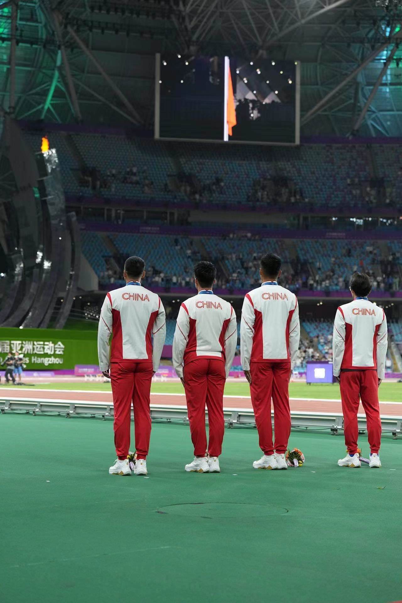 補(bǔ)發(fā)現(xiàn)場,首先頒發(fā)的是男子4×100米接力銅牌。四位中國小伙子笑著走上銅牌領(lǐng)獎臺,接受頒獎。隨后的競走頒獎儀式上,在三位得獎運(yùn)動員獲頒獎牌后,《義勇軍進(jìn)行曲》奏響,三面五星紅旗冉冉升起,切陽什姐眼中涌動著晶瑩的淚花。